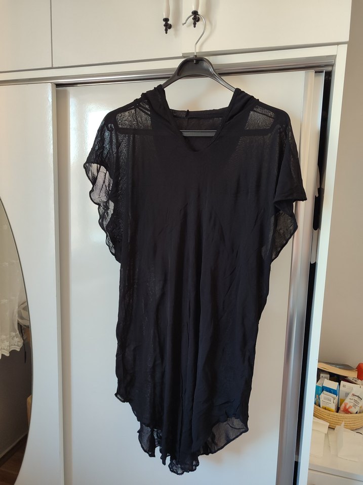 Siyah renkte, keten kumaştan, V yakalı pareo. Kısa kollu, midi boyda ve rahat kalıplı, günlük kullanıma uygun.
