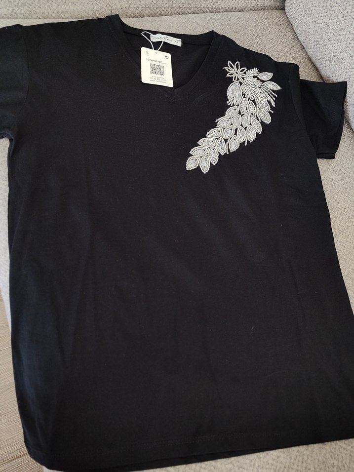 Siyah V yakalı, kısa kollu, bol kesim kadın tişörtü, pamuklu kumaş ve payetli çiçek baskısıyla günlük kullanıma uygun.