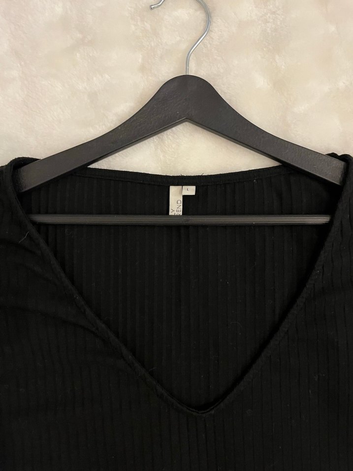 V yaka, pileli ve uzun kollu siyah yumuşak keten kumaştan, minimalist ve günlük kullanım için uygundur.