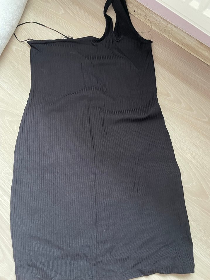 V yaka ve kolsuz tasarıma sahip, pilili detaylı siyah triko elbise. Midi boy ve yumuşak sentetik kumaştan, trend sokak stili için uygun.