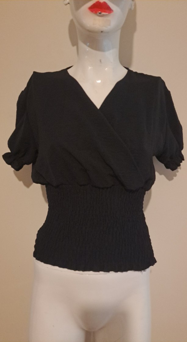 Siyah renkli, V yakalı ve kısa kollu pilili bluz. Üst kısmı bol, bel kısmı lastikli ve vücuda oturan yapıda, sentetik ve pürüzsüz kumaştan üretilmiştir.
