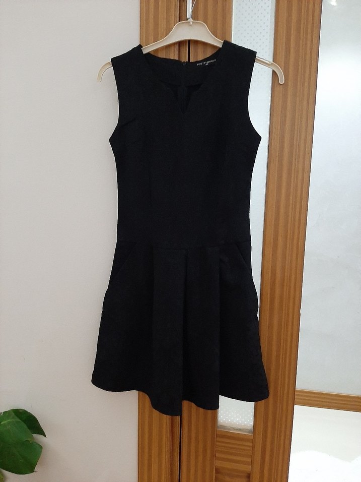 Kolsuz, v yaka siyah midi elbise, pilili detaylarla minimalist gotik tarzda. Günlük kullanım için sentetik kumaştan yapılmıştır.