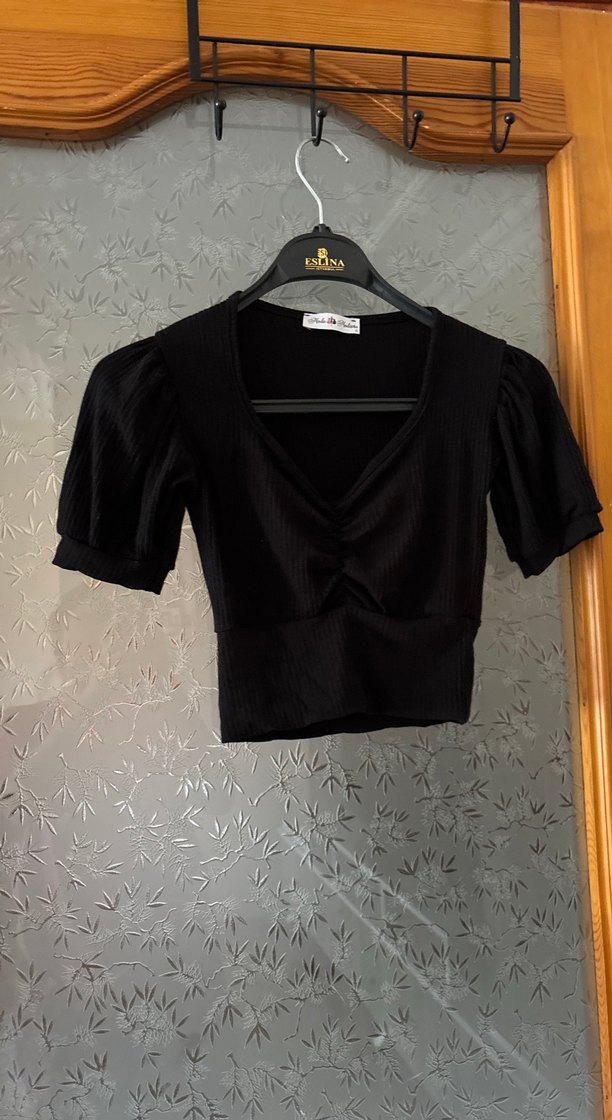 Siyah, v yaka ve kısa pilili kollara sahip, sentetik kumaştan yapılmış, dar kesim mini bluz. Günlük kullanıma uygun şık ve rahat.