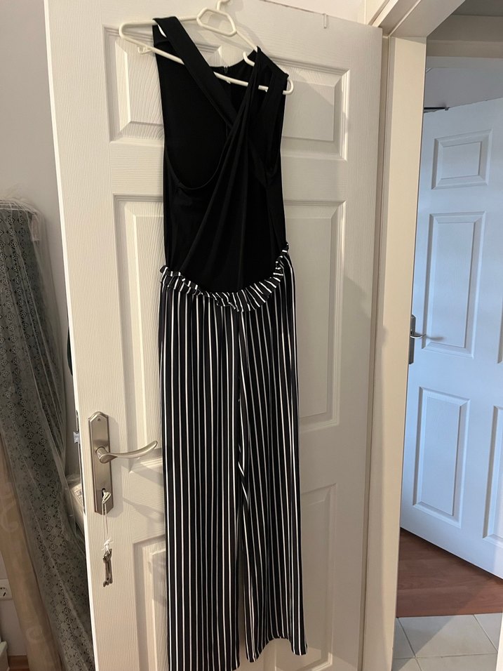 Siyah, V yakalı, kolsuz üst kısmı ve uzun, pilili çizgili pantolonlarıyla, günlük kullanım için uygun çağdaş tarzda tulum.✨