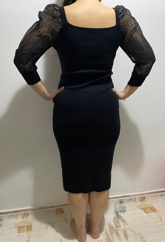 Siyah, v yakalı, piliseli transparan kolları ve dar kesimiyle cesur bir iş ortamı için uygun kalem elbise.