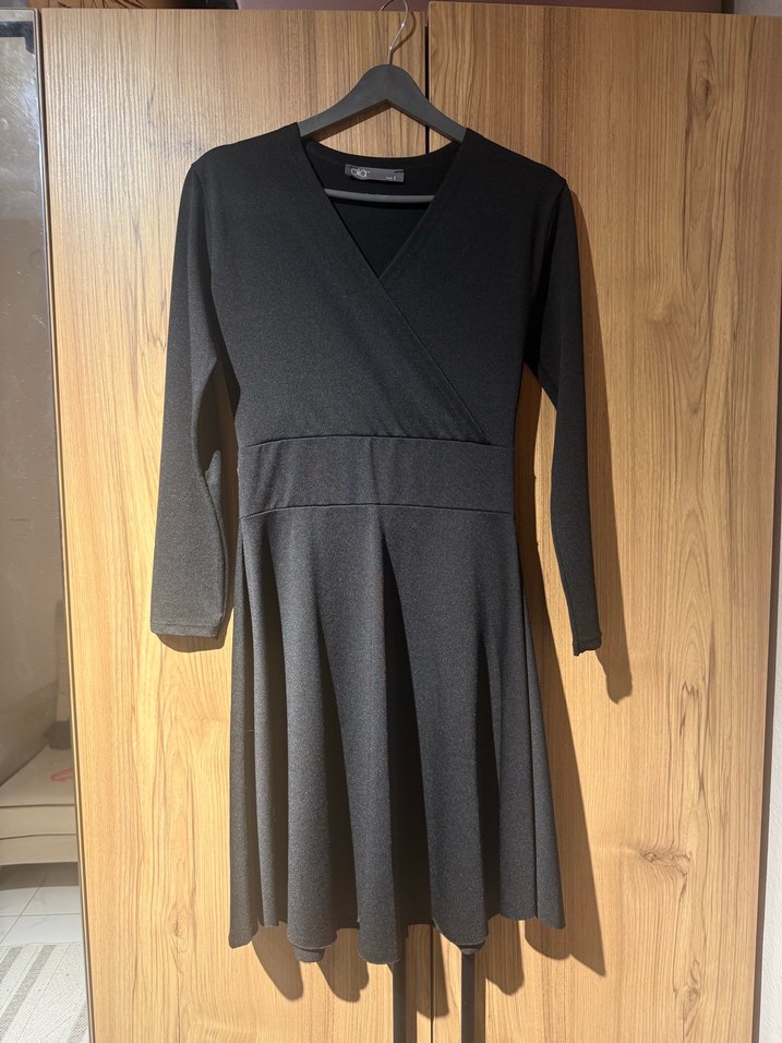 Siyah renkte, V yakalı ve uzun kollu piliseli midi boy elbisedir. İnce oturan kesimi ve yumuşak sentetik kumaşı ile ofis kullanımı için uygundur.