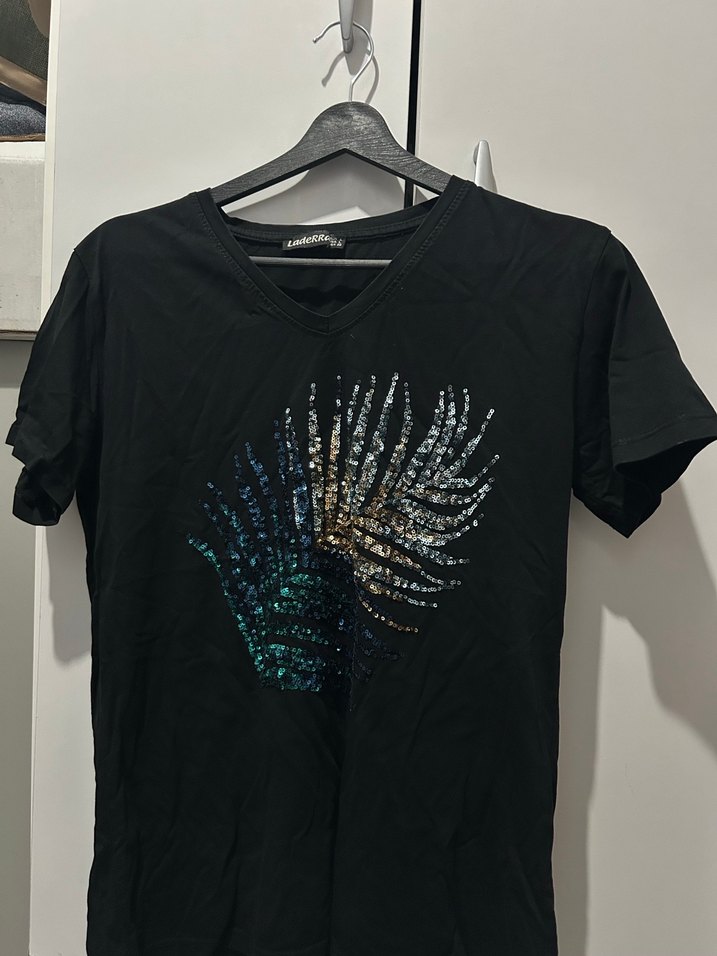 Siyah kısa kollu, V yakalı, bol kesim tişört. Sentetik kumaş üzerine pul işlemeli baskı detayıyla dikkat çeker. ✨