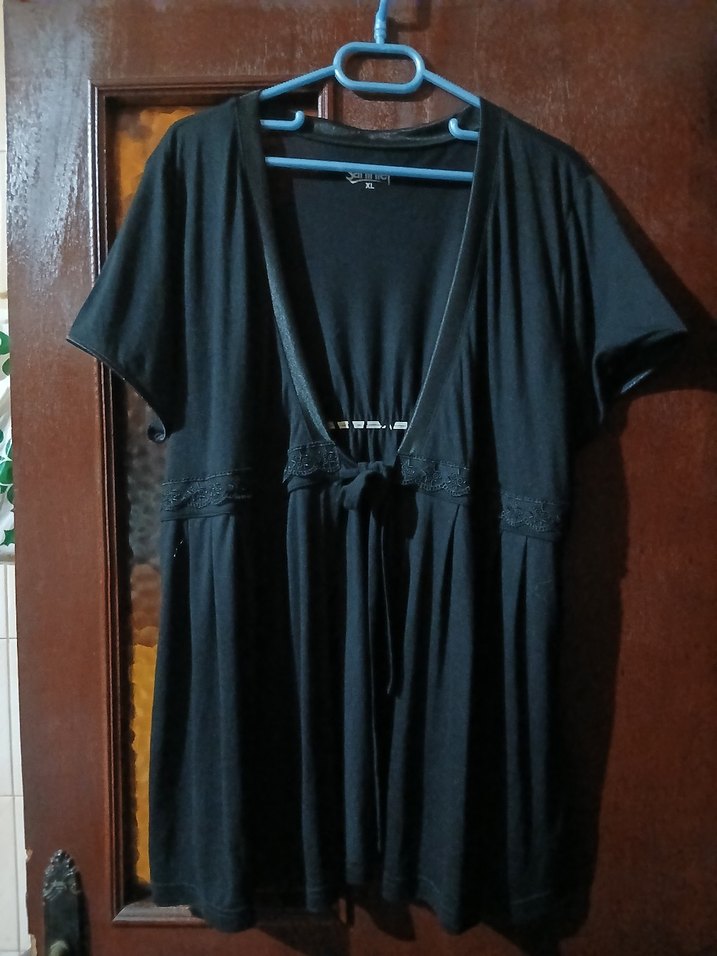 Şahinler marka Siyah renkte, V yakalı, salaş kesim kısa kollu mini sabahlık. Belde bağcık ve drapeli detaylar bulunur, yumuşak sentetik pamuk kumaştan üretilmiştir. yeniden farksızdır.