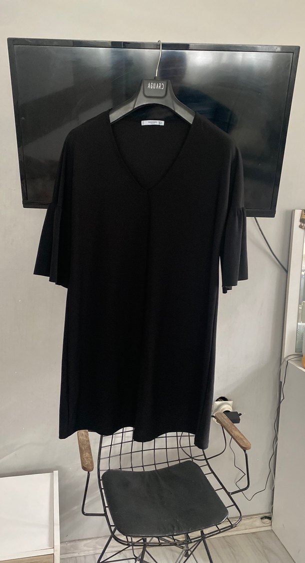 Siyah renkte, V yaka ve kısa kollu, salaş kesim midi boy triko elbisedir. Drapeli tasarımıyla günlük rahat kullanıma uygundur. Yumuşak sentetik kumaştan üretilmiştir.