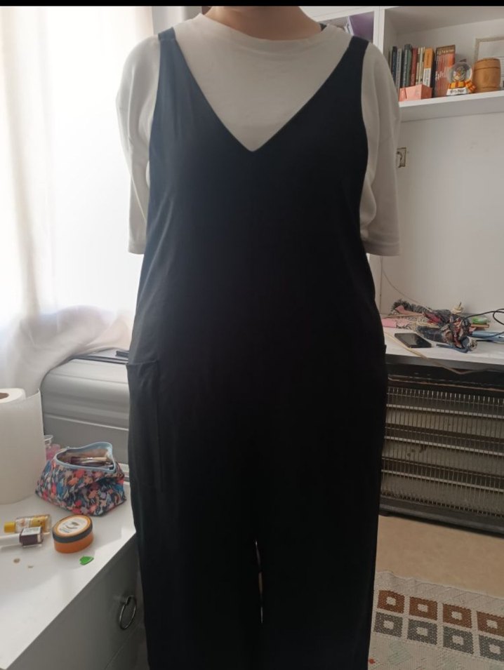 Siyah, V yakalı ve kolsuz hamile tulumu, salaş kesimi ve sentetik kumaşıyla günlük rahatlık sunar. Rahat ve şık bir tercih.