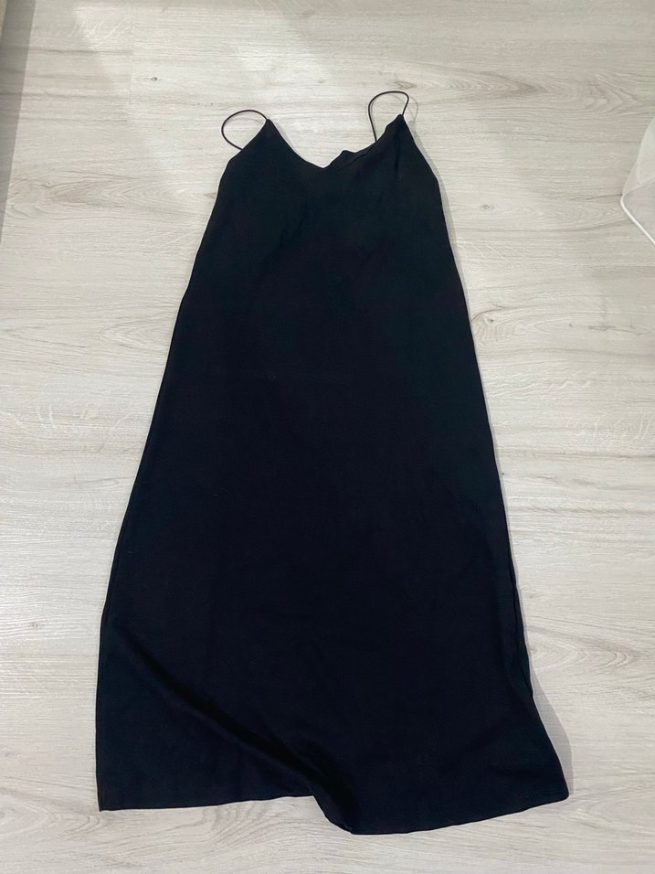 Siyah, kolsuz, V yakalı, salaş kesim uzun elbise, ipeksi kumaştan, drapeli detaylı, minimalist ve sokak stili için uygun.
