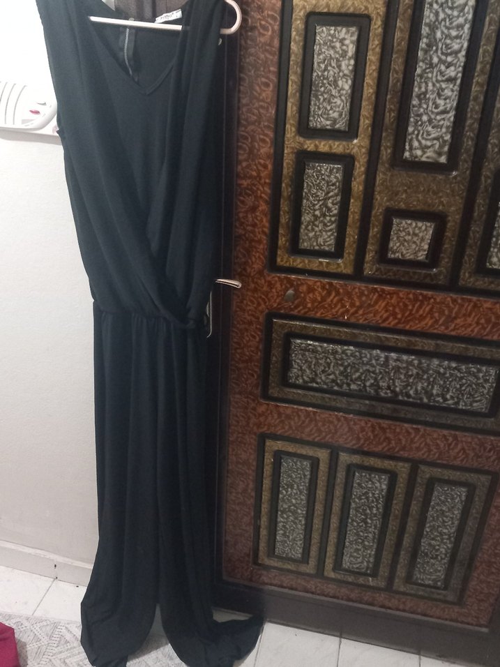 Siyah uzun elbise, salaş kesim ve drapeli tasarıma sahiptir. V yaka ve kolsuzdur, yumuşak sentetik kumaştan yapılmıştır. Mütevazı, bohem ofis tarzına uygundur.