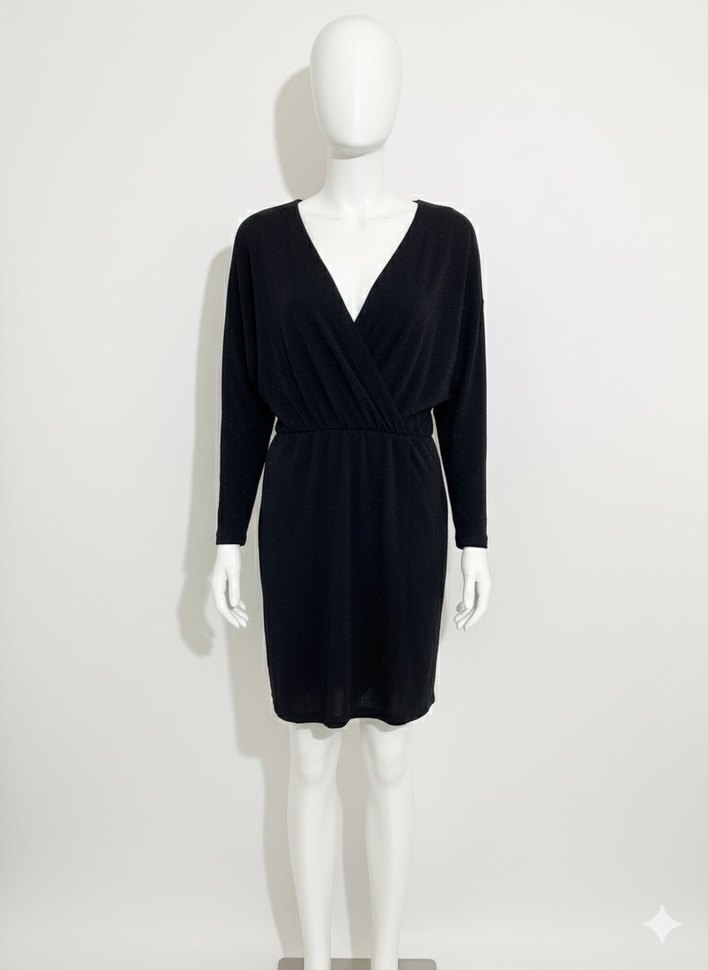 Siyah mini elbise, V yaka ve uzun kollu, drapeli ve vücuda oturan kesimiyle minimalist ve şık bir ofis görünümü sunar.