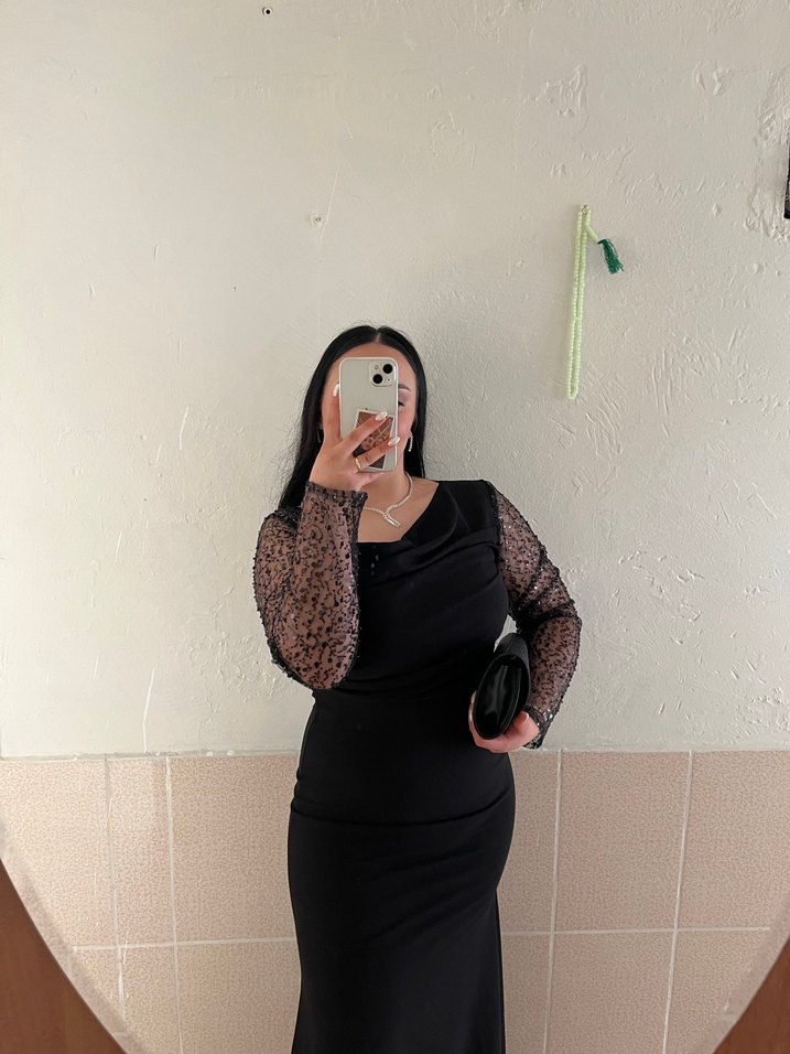 Siyah, v yakalı, transparan uzun kollu, yılan desenli, saten dokulu ve dar kesim midi elbise, iddialı romantik akşamlar için uygun.