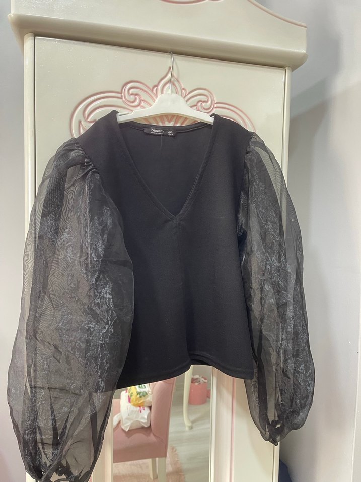 Siyah bluz V yaka, uzun transparan kollu, drapeli ve bol kesim, kısa boyda, gotik tarz için uygun.