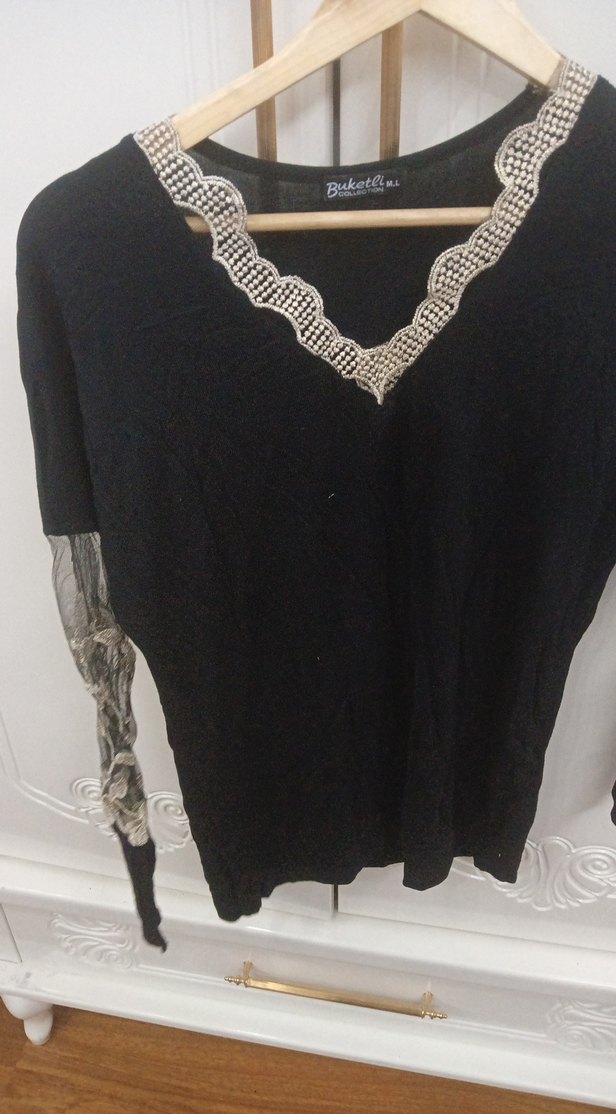 Siyah renkli, V yaka ve dantel detaylı uzun kollu triko bluz, rahat ve bol kesimdir, günlük kullanıma uygundur.