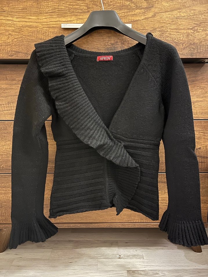 Bu siyah, V yaka ve uzun kollu triko kazak, fitted kesim ve fırfırlı detaylara sahiptir. Kısa boylu, goth tarzında ve rahat bir görünüme sahiptir. S-m uyumlu