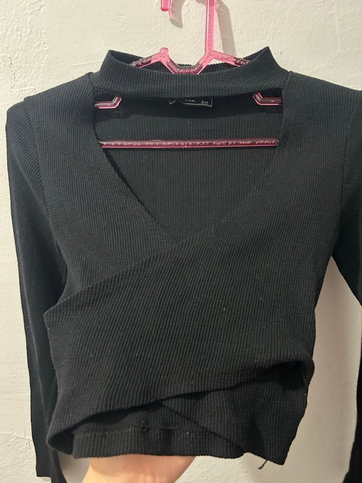 V yaka, uzun kollu ve triko dokulu siyah, fitted kesim kadın bluz. Midi boyda, desensiz ve rahat sokak stiline uygun.