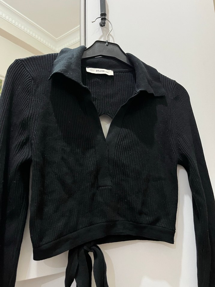 V yaka ve uzun kollu, siyah triko dokulu süet kumaştan yapılmış, beli bağlamalı, günlük sokak stiline uygun dar kesim bluz.