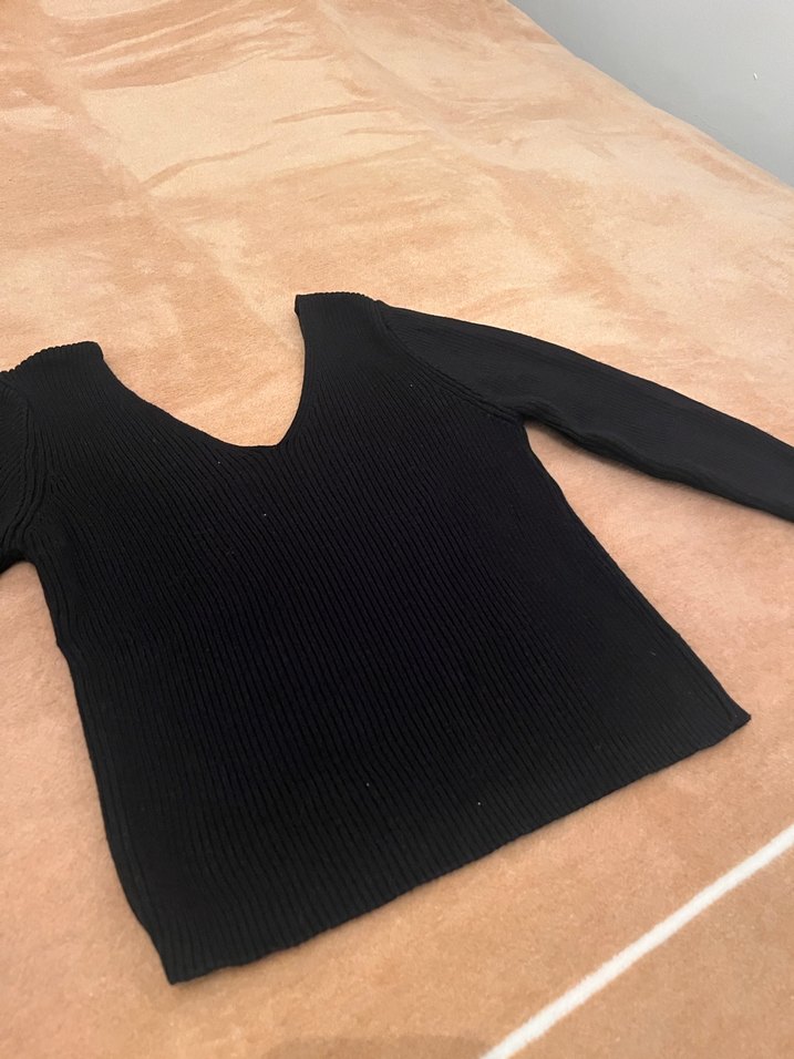 V yaka ve uzun kollu, siyah, triko dokuma, vücuda oturan rahat ve sade kadın kazak.