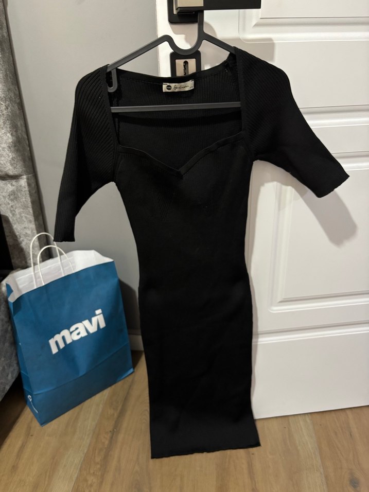 Siyah renk, V yaka ve kısa kollu, ince triko kumaştan yapılmış, fitted kesim midi elbise. Günlük sokak stiline uygun baskılı desene sahiptir.
