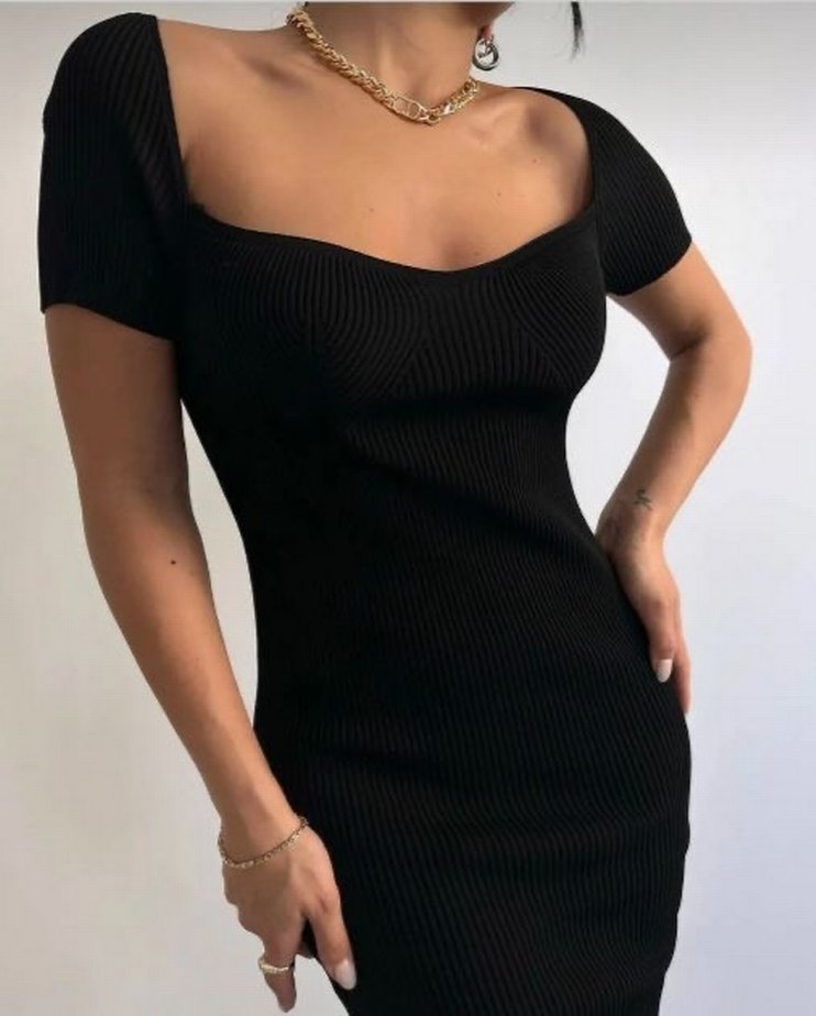 V yaka ve ince askılı kısa kollu, siyah triko midi elbise. Yumuşak sentetik kumaştan, minimalist sokak stili için uygun, günlük kullanıma ideal. Diz üstünde kısa elbisedir