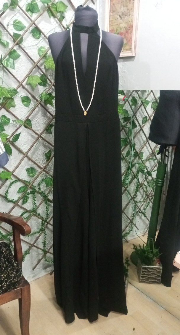 Kolsuz, V yakalı, siyah uzun tulum İpek gibi kumaştan, klasik goth tarzında, düğün için uygun, rahat kesim.sirt dekolteli fermuarlı şortlu içten dışındaki pantolon kapaklı