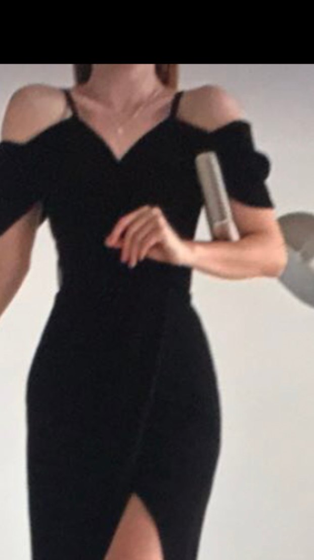 Bu siyah, v yaka, ince askılı ve uzun abiye elbise, cesur yırtmaç detayıyla dikkat çeker. Romantik akşamlar için idealdir.ELBİSE boyu144 cmbeli lastiklidir.