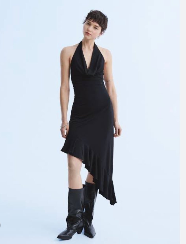 Siyah V Yaka Uzun Asimetrik Kesim Elbise