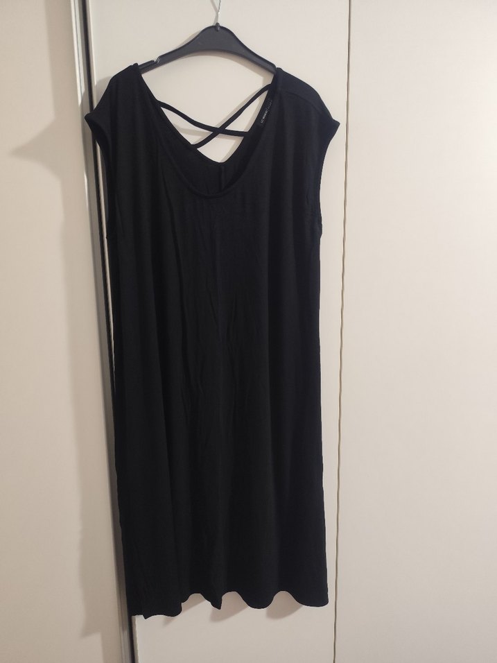 Siyah uzun elbise, askılı kol, sirti çapraz bantlı V yaka ve dökümlü bol kesim, yumuşak sentetik kumaştan üretilmiştir.