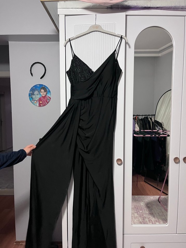 Siyah, drapeli ve askılı uzun tulum, V yakası ve şık kesimiyle romantik akşamlar için uygundur. Gotik tarzda, ipeksi dokulu bir parçadır.