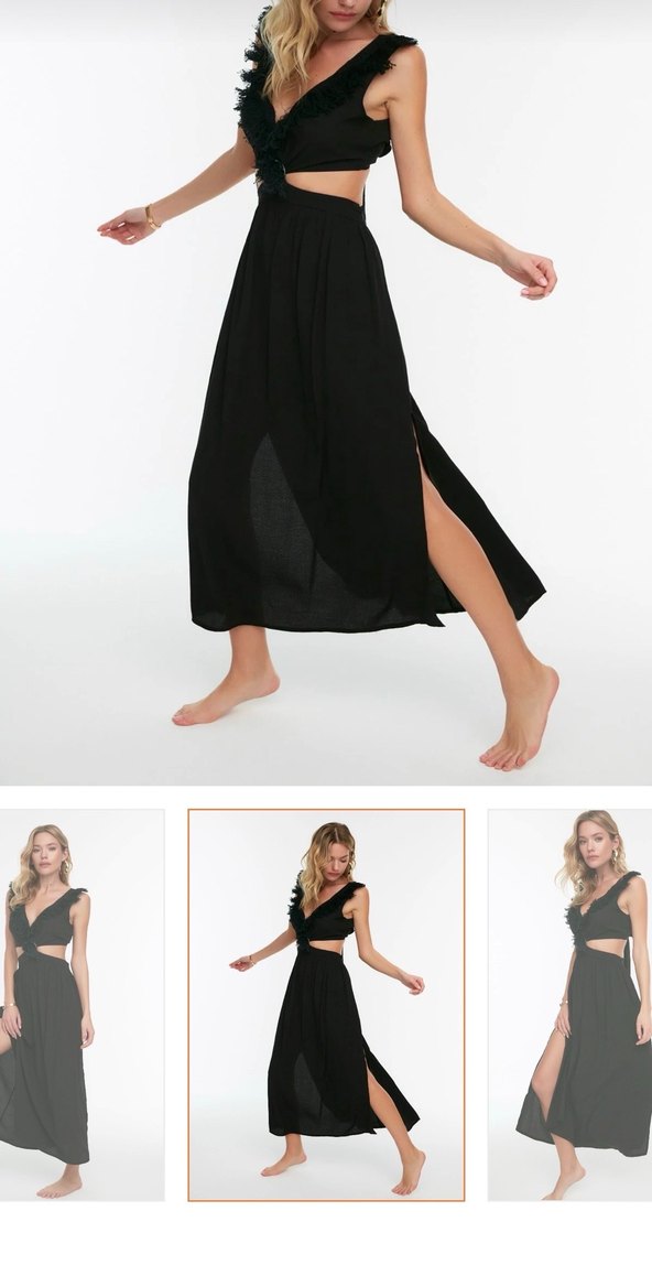 Siyah uzun elbise, bol kesim ve drapeli detaylara sahip. İpek gibi kumaştan, kolsuz ve bohem tarzda, parti için uygun.