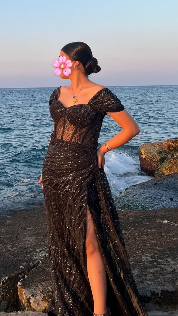 Bu siyah uzun abiye elbise, V yakalı, drapeli ve desenli tasarımı ile dikkat çekiyor. İnce askılı ve vücuda oturan kesimle cesur ve gösterişli bir görünüm sunar.