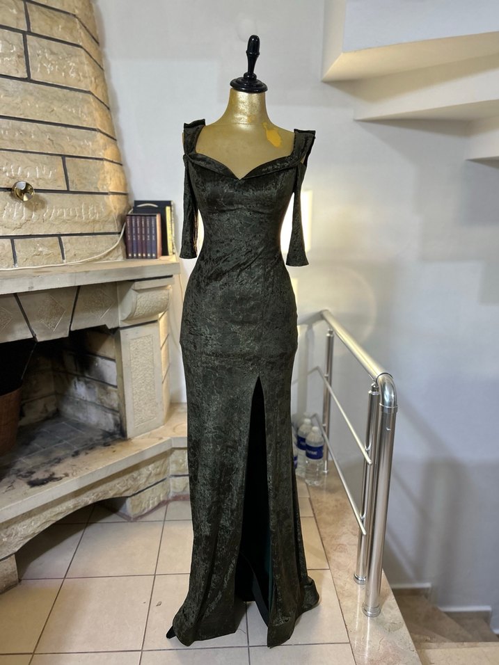 Siyah renkte, V yakalı ve drapeli detaylara sahip uzun abiye elbise. Kolsuz, regular fit ve önünde yırtmaç bulunur. Klasik ve gotik tarzı bir araya getirir. 34-36-38 bedenler için uygundur.