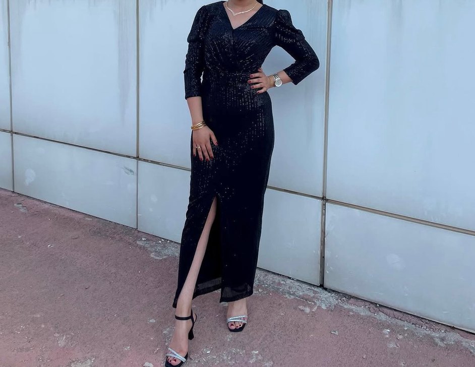Siyah uzun abiye elbise, drapeli kesim ve V yaka ile klasik şıklık sunar. İnce askılı kolları ve yılan deseni dokusuyla romantik akşamlar için uygundur.