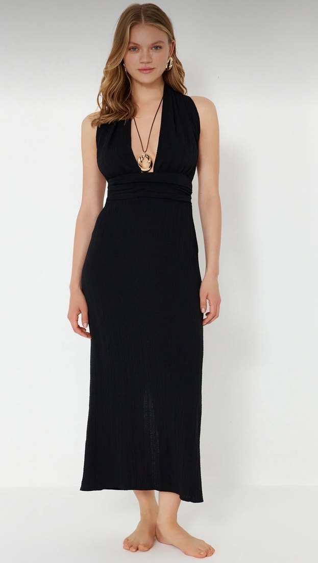 Siyah uzun ve v yaka, ince askılı dar kesim elbise. İpeksi kumaştan drapeli detaylı, minimalist gotik tarzda romantik akşamlar için uygun. Plaj kullanımı içinde uygundur sadece 1 kere giyildi.