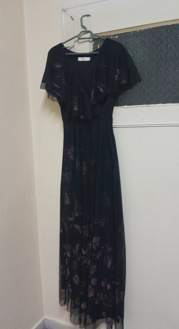 Siyah uzun gece elbisesi, V yaka ve drapeli tasarıma sahip. Bol kesim, kolsuz ve tie-dye desenlidir. Gotik düğünler için uygundur. 36 38 beden uyumlu