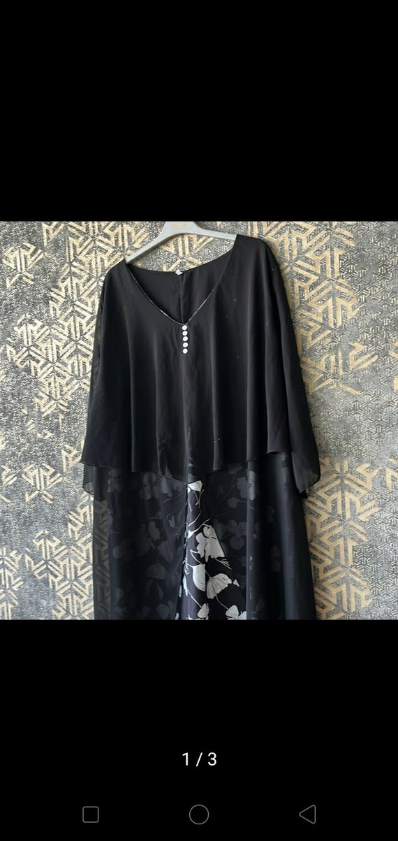Siyah uzun elbise, V yakalı ve bol kesimdir, drapeli kollara sahiptir. Sentetik kumaştan üretilmiş, günlük kullanım için hafif desenlidir. Yurtdışı ürünü yıkandı kullanılmadı