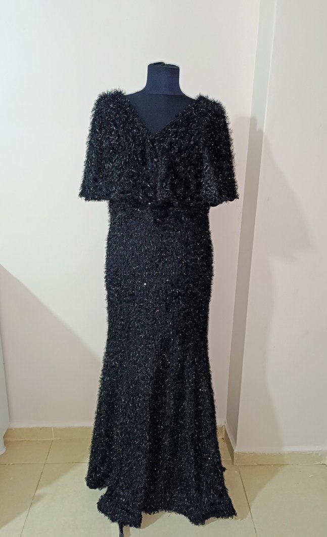 Siyah uzun abiye elbise, v yaka ve drapeli tasarıma sahip. Regular fit, kolsuz ve desensiz, partiler için ideal, goth ve gösterişli tarzlara uygun. ✨ 36-44 beden arası uyumludur asansör bedendir