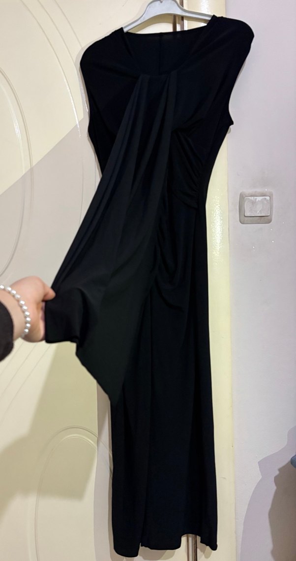 Siyah, uzun ve drapeli kesime sahip, V yakalı ve kolsuz, ipeksi dokulu dar kesim kadın elbisesi. Gotik stile ve ofis kullanıma uygundur.