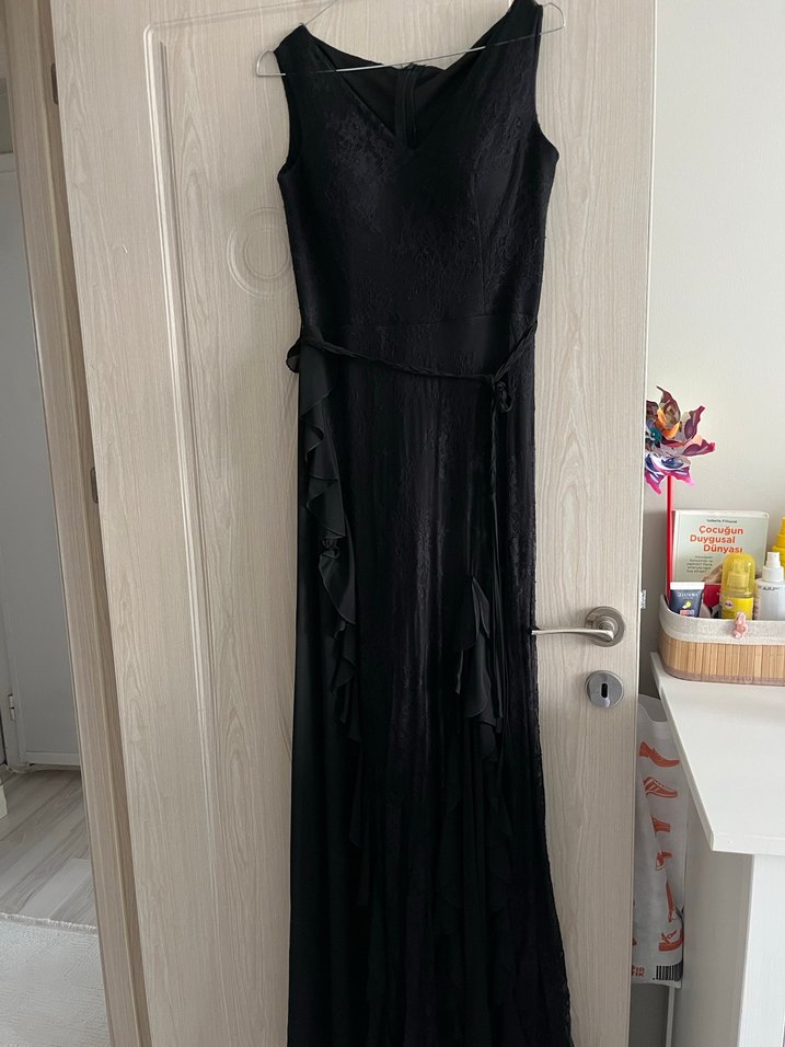 Kolsuz, v yaka, siyah uzun abiye elbise. Yanlarda fırfır detaylarıyla gotik ve zarif bir görünüm sunar. Düğün için uygundur.