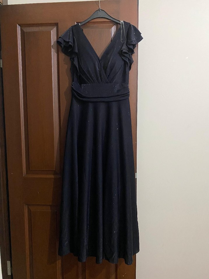 Siyah, v yaka ve kolsuz, drapeli uzun abiye elbise, gotik tarzda klasik şıklık sunar. sadece 1 kez 3 saat giyildi kusursuzdur 44 beden etiketli ama 38 uyumlu