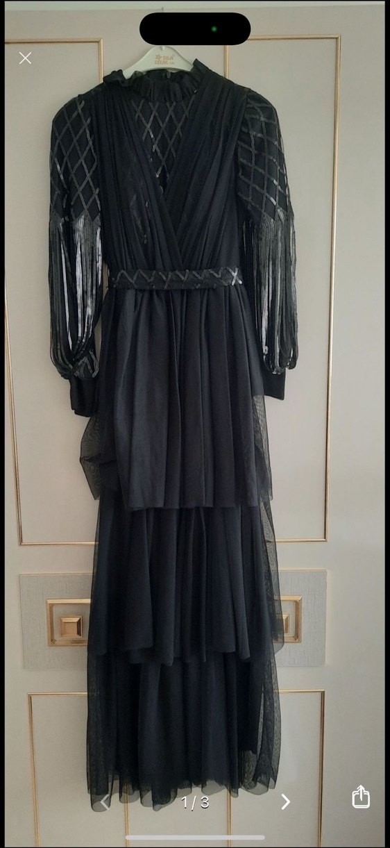 Siyah uzun abiye elbise, drapeli tasarımı, desenli uzun kolları ve V yakası ile gotik stilde. Bol kesim, düğünler için uygun.