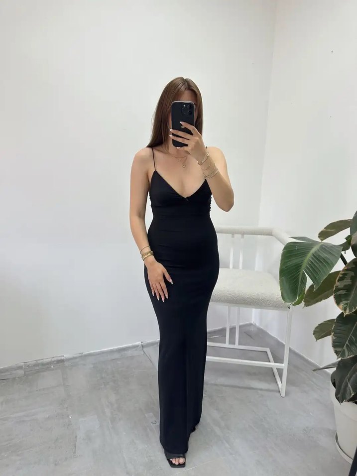 Bershka siyah V Yaka Uzun İnce Askılı Elbise