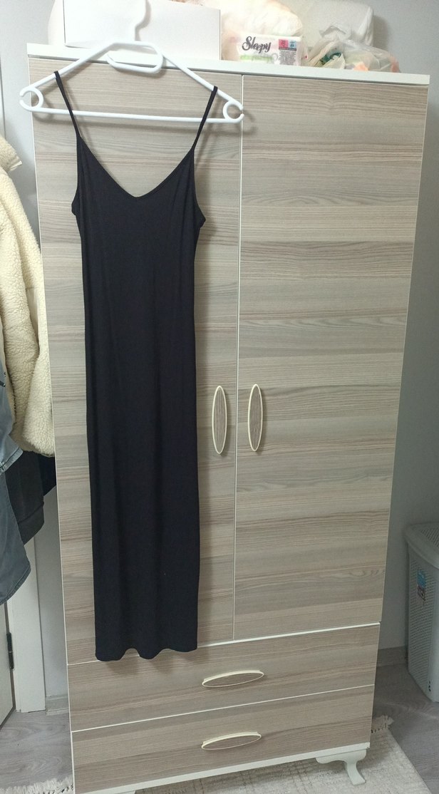 Siyah, kolsuz, uzun ve v yaka olan bu elbise ince kesimiyle minimalist ve normcore tarzını yansıtıyor. Günlük kullanıma uygun, rahat ve şık.