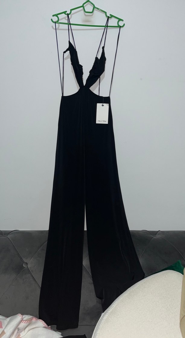 Siyah uzun tulum, V yaka ve ince askılarla tasarlanmıştır. İpek gibi kumaştan yapılmış, regular fit ve yırtmaç detayı bulunmaktadır. Minimalist gotik stil, romantik akşamlar için ideal.