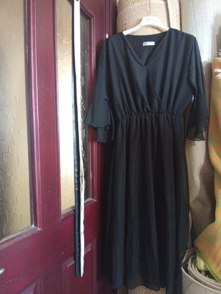 Siyah uzun elbise, V yaka ve drapeli kısa kollara sahiptir. Sentetik kumaştan, bol kesim ve günlük kullanıma uygun gotik tarzda. 36-38 beden çok az kullanılmış