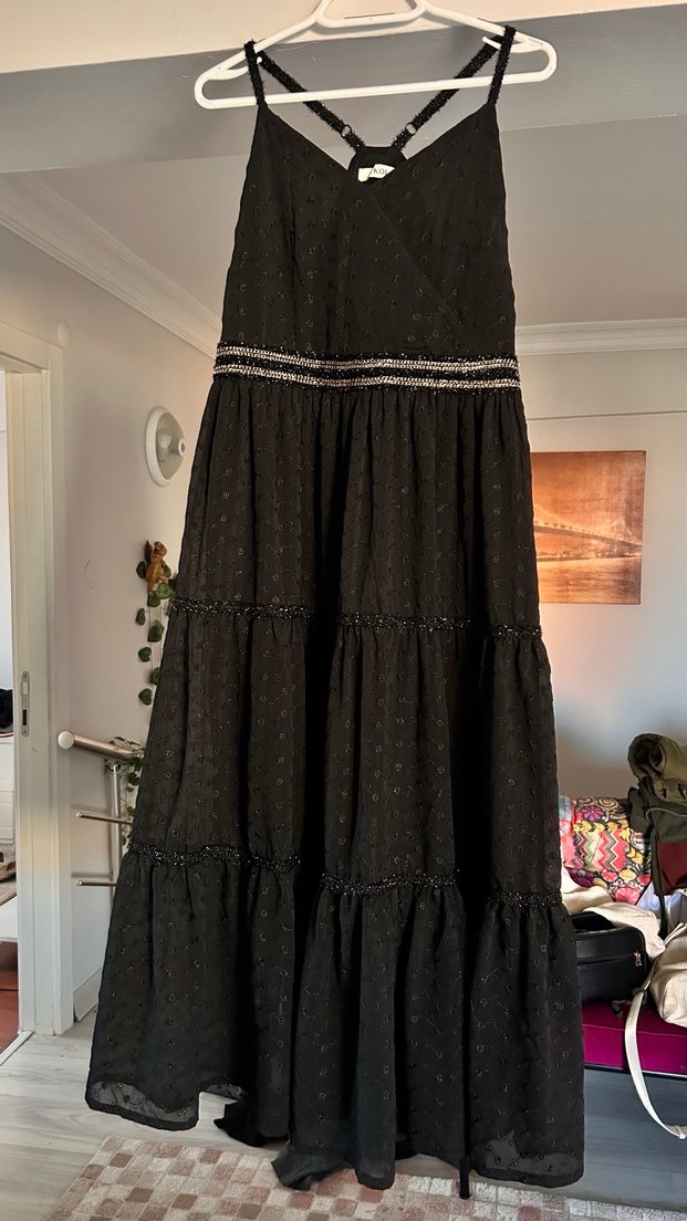 Siyah uzun elbise, V yaka ve işlemeli desenlerle ruffle detaylara sahiptir. Salaş kesimi ve ince askılarıyla romantik akşamlar için uygundur. tam boy 123 cm 40 bedene uygun kusursuz.1 kere düğünde giyildi