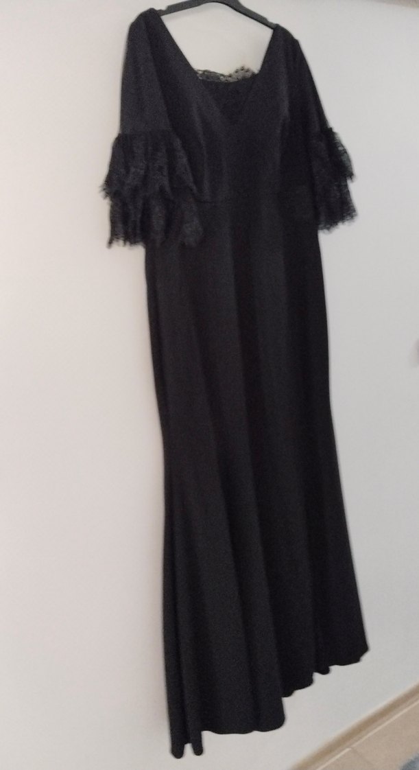 doridorca Siyah uzun elbise, satenimsi kumaş, bol kesim ve V yakaya sahiptir. Kolsuz ve fırfır detaylıdır, gotik ve avant-garde tarzlar için uygundur. Düğünlerde tercih edilebilir.