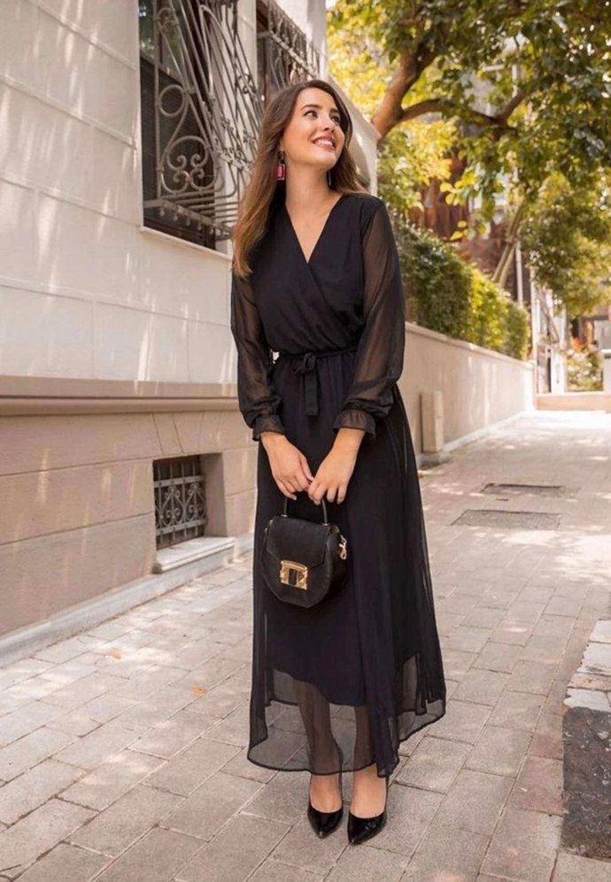 Siyah, V yakalı ve kemerli uzun elbise. Bir kes evde denendi sıfır ayarında